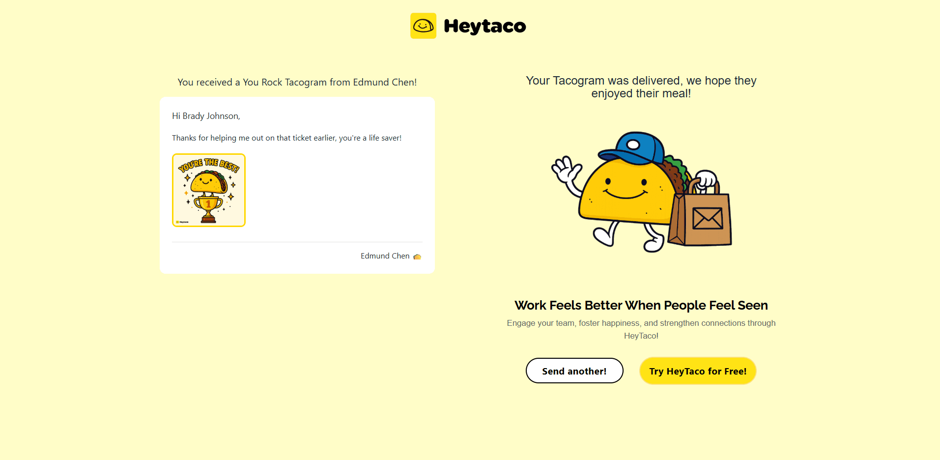 HeyTaco is an app for Slack and Microsoft Teams that promotes employee recognition by allowing teammates to send each other “tacos” as kudos, strengthening peer-to-peer connection. I’ve worked freelance with HeyTaco since May, previously conducting a UX audit for their site.
